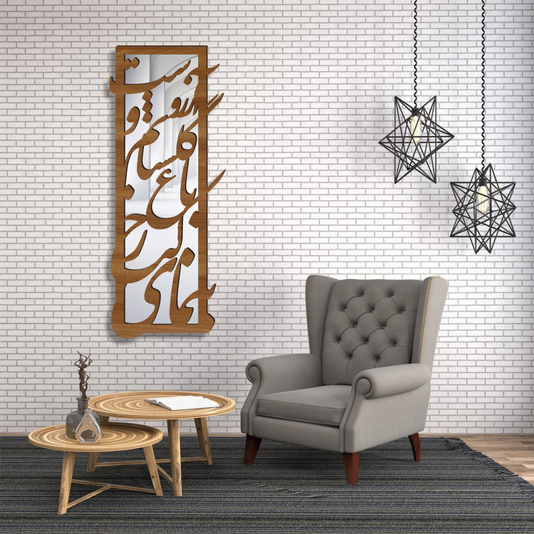 خط نستعلیق نشانهای بارز از طبع و سلیقه زیبایی شناختی ایرانیان است و بیشک زیباترین و ظریفترین خط در میان خطوط اسلامی است و قرار گرفتن آن در کنار آینه که از دیر باز در فرهنگ ایرانیان جایگاهی والا داشته لطافتش را دو چندان میکند. در اثر فوق بیتی از غزل حضرت عشق مولانا بر روی ام دی اف برش خورده و روی آینه قرار داده شده است.متن: بنمای رخ که باغ و گلستانم آرزوست.